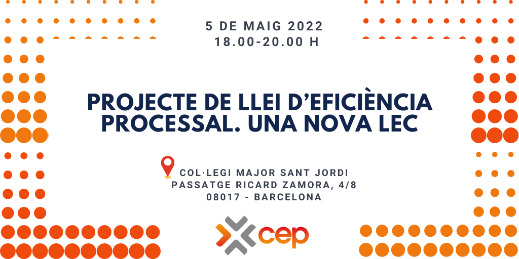 Per tot això i per la seva rellevància, des del CEP hem organitzat una sessió informativa gratuïta a càrrec de Vicente  Pérez Daudí, Catedràtic de Dret Processal a la UB, i Isidor Garcia, assessor normatiu de l’ICPB, en la qual exposaran i debatran les novetats que implementa aquest text normatiu en l’àmbit del procediment civil.