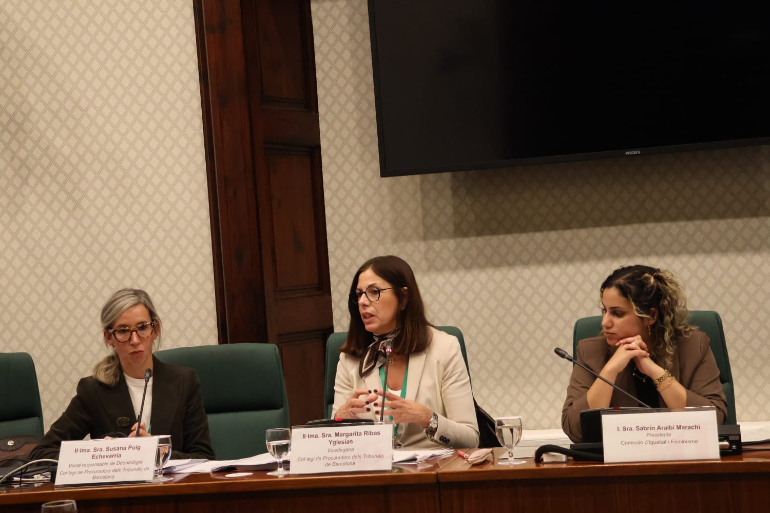 La vicedegana va estar acompanyada per Susana Puig Echeverría, vocal responsable de deontologia de l’ICPB. Després de l’exposició inicial de Ribas Yglesias, va arribar el torn de preguntes de les diputades dels diversos grups parlamentaris, que van ser respostes per les dues representants de la Junta de Govern del Col·legi de Procuradors de Barcelona.